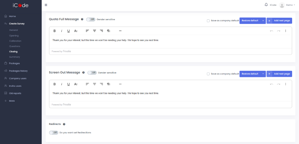 Quota Full Message is a message that a respondent receives when his/her sex/age group is already full and his/her answers are not required for the survey.