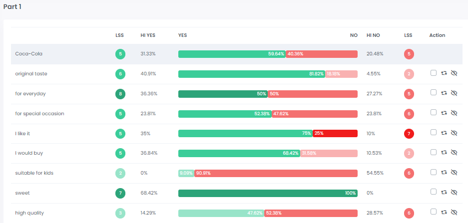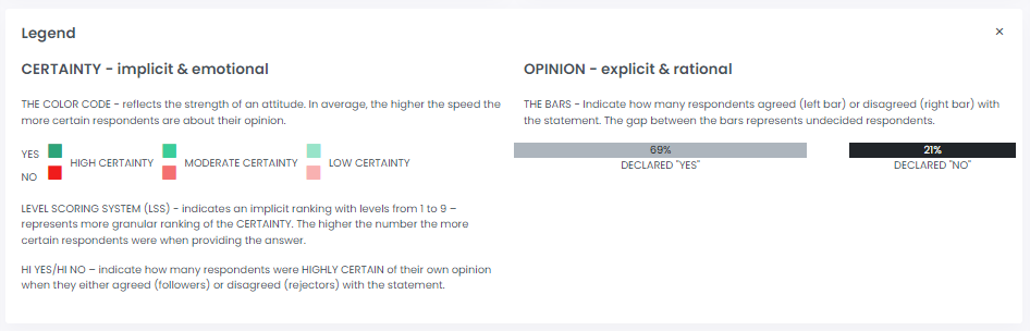 LSS indicates an implicit ranking with levels from 1 to 9 (the simplified LSS scores, established to increase the interpretation capabilities) and was created in accordance with the NEUROHM RT Benchmark Database. It is based on numerous studies from various cultures, that have been generated for many years. The index has a range from 0 to 1000 IMP and it represents more granular ranking of the certainty. The higher the value, the more certain respondents were when providing the answer and the faster speed of an answer was, meaning there is higher implicit emotional accessibility or certainty of the explicit rational opinion. Those ranges generate the simplified LSS scores, as they were created to increase the interpretation capabilities.