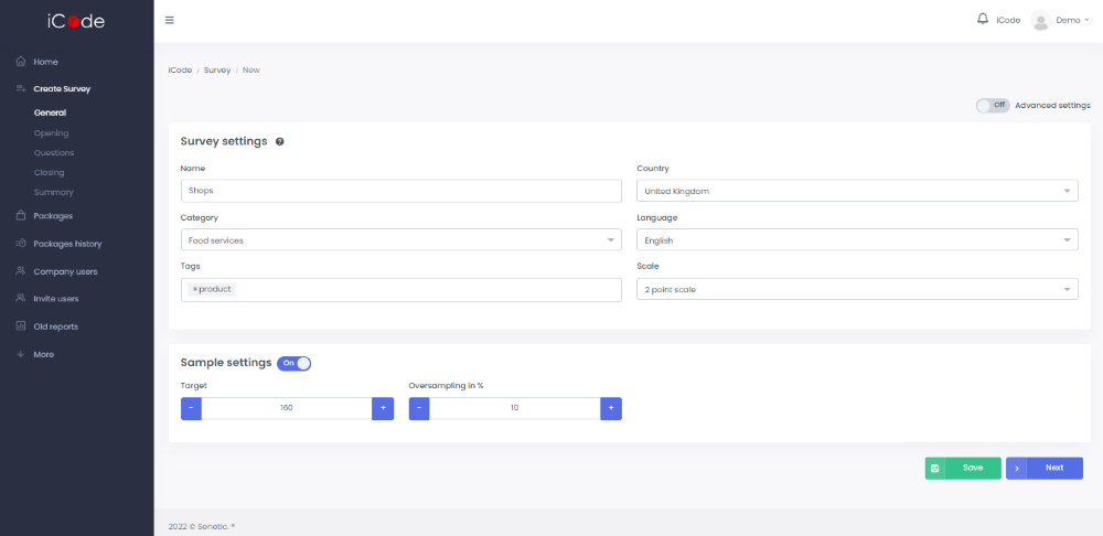 Next you should specify the Survey settings and define the target and oversampling for your survey in Sample settings.
