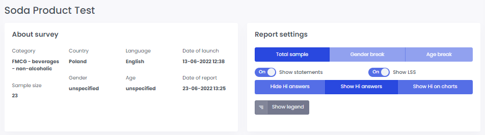 Through Report settings you are able to decide which aspects of your results you want to observe at a particular moment. You can also view a legend there.