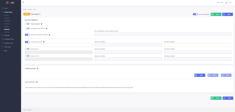 At this step, in Redirects section, you may set up redirections. They may be required if this survey is going to be a part of a bigger project or a panel provider is responsible for data collection. This option allows you to connect an iCode survey with other platforms and pass variables between surveys.