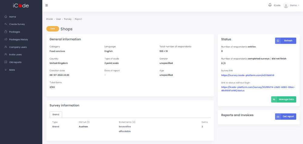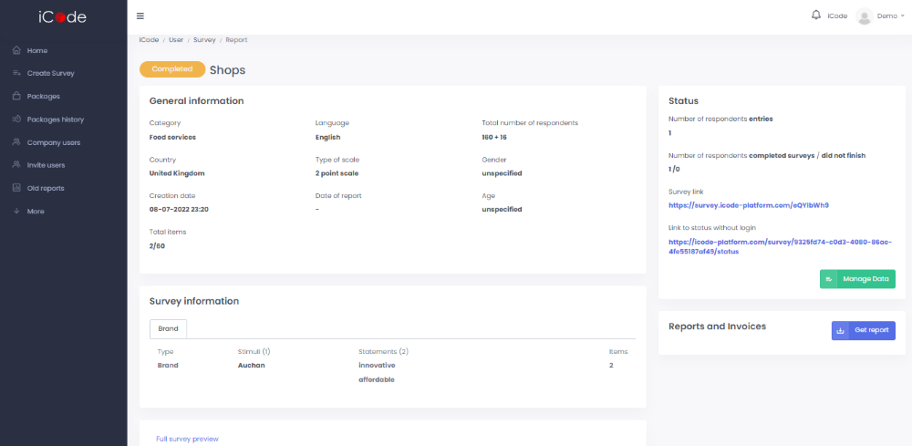 If your survey reached a minimum number of respondents and you want to download your results, click on the Get Report button. For further explanation, see PAYMENT METHODS AND PACKAGES section in this Help.