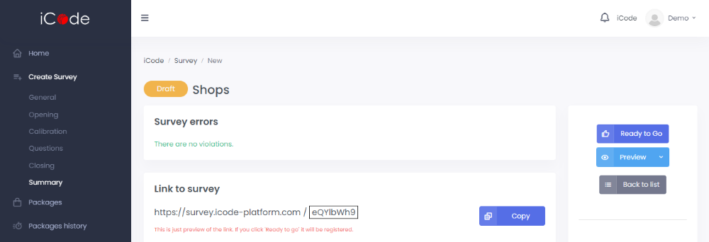 When your survey is a completed draft, at this stage you can also preview the link that you will be later sending to your respondents. The link is not registered yet.