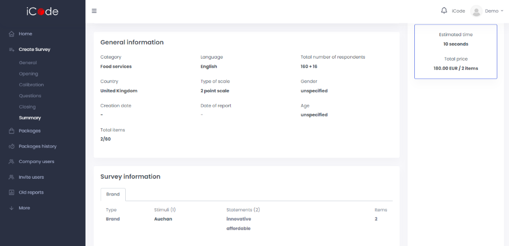 In the General information part you can find detailed information about the survey and a structure of a sample you want to test.