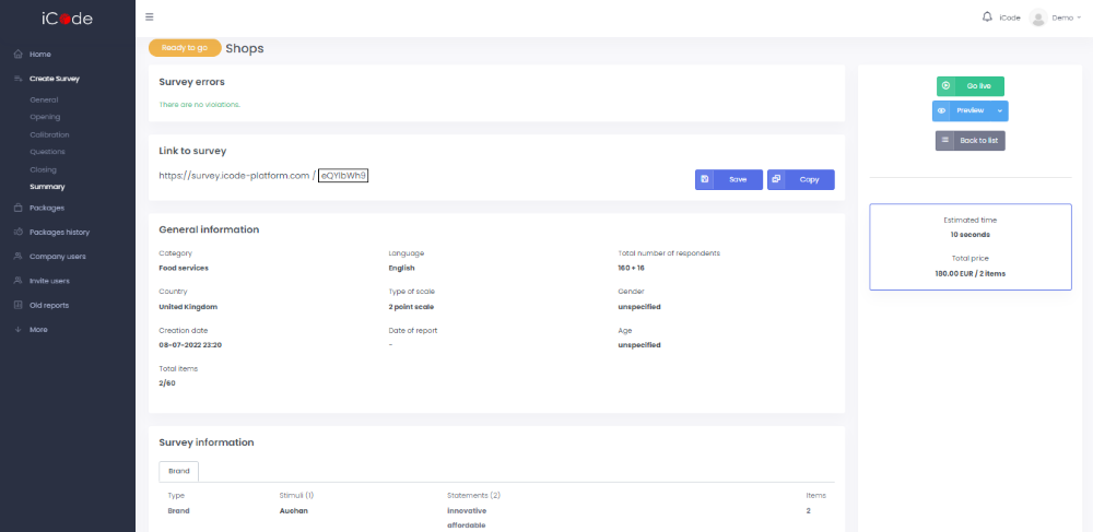After making the survey Live, the data collecting process starts. To access the link to the survey, which you shold forward to your respondents, click on the green icon of an eye in the Actions section, which is going to forward you to a screen summarizing the structure if your survey.